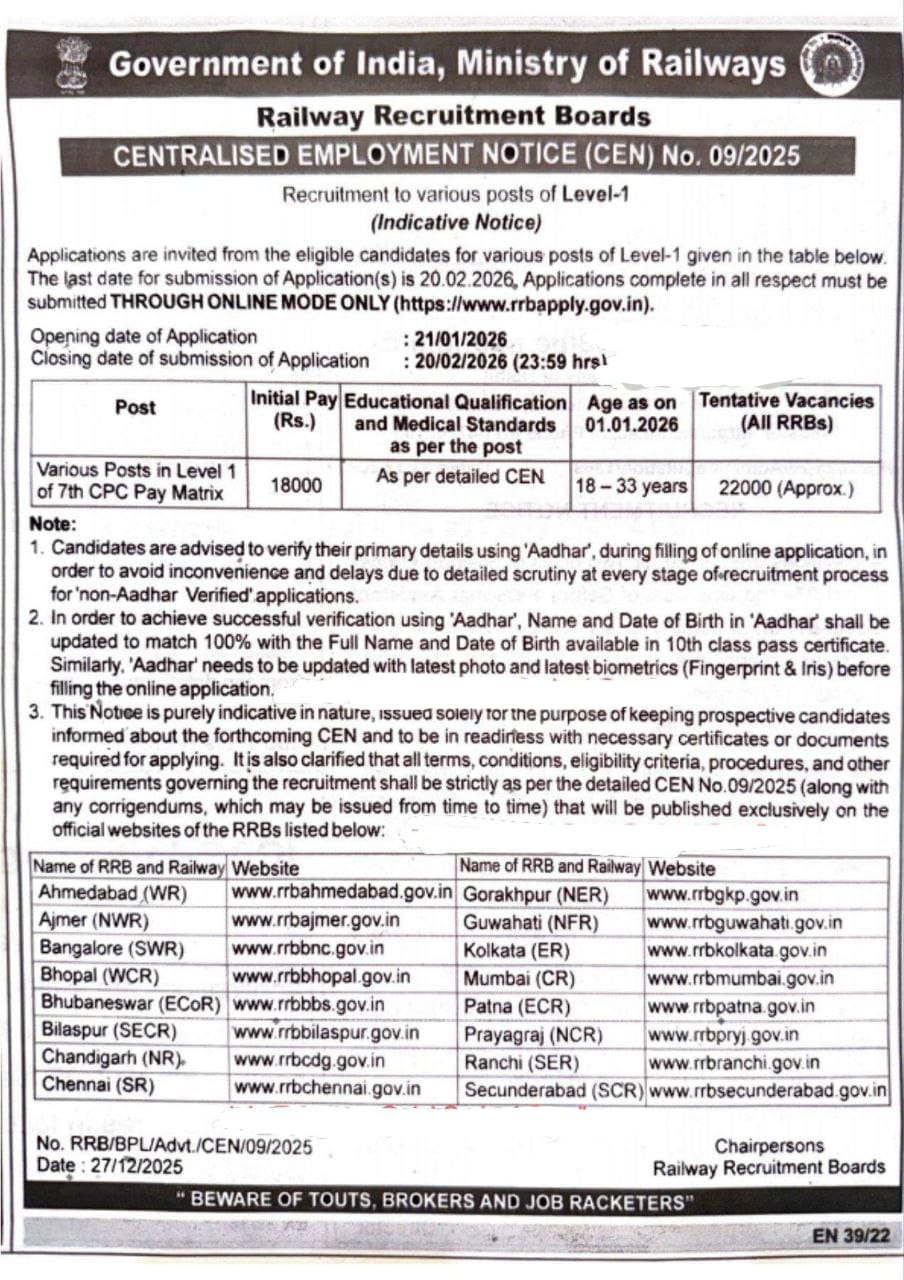 RRB Group D Recruitment 2026 is a railway job notification for 22,000 Group D posts in Indian Railways.